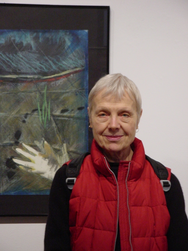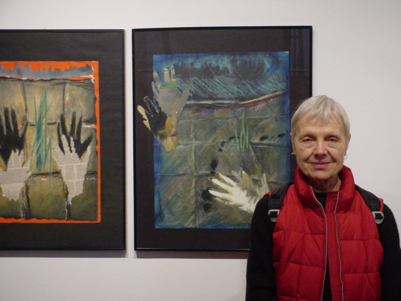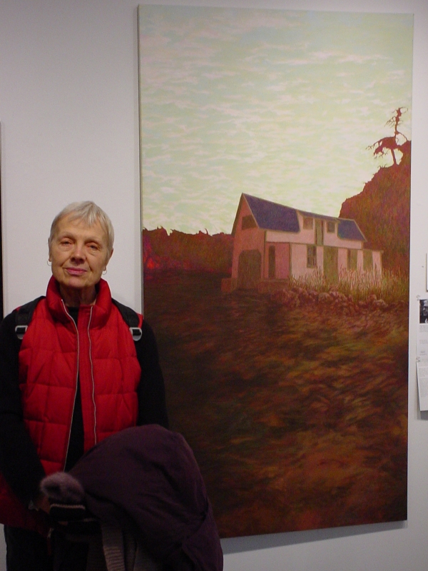 The two photos, below, are of her with alternatives of artwork comissioned for the dust jacket of one of Hugh Hood's book of short stories, A Short Walk in the Rain The Collected Stories: II. These were not chosen to be on the cover. Please see isolationbooth page to see the final selections for the other collected books in the series.